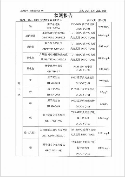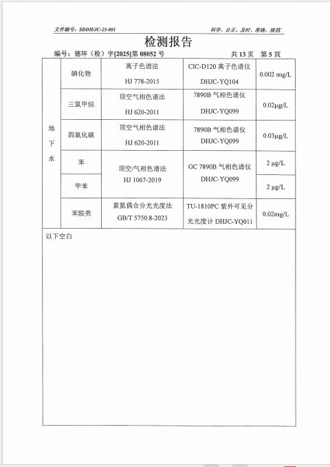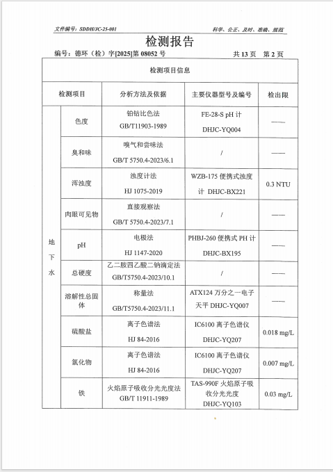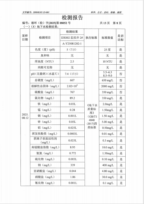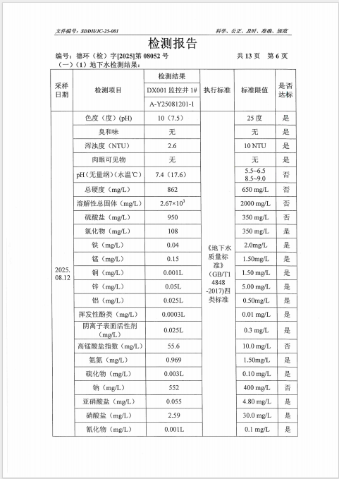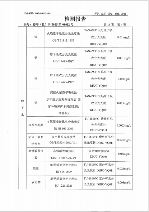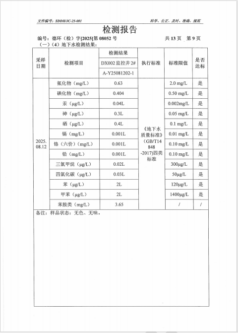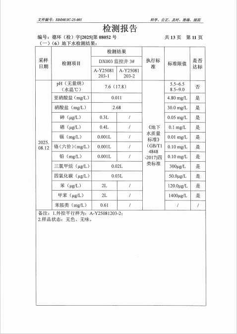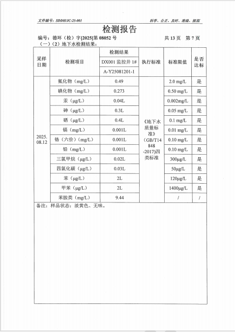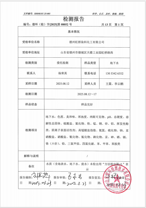 德州虹桥染料化工有限公司2025年第三季度地下水检测报告